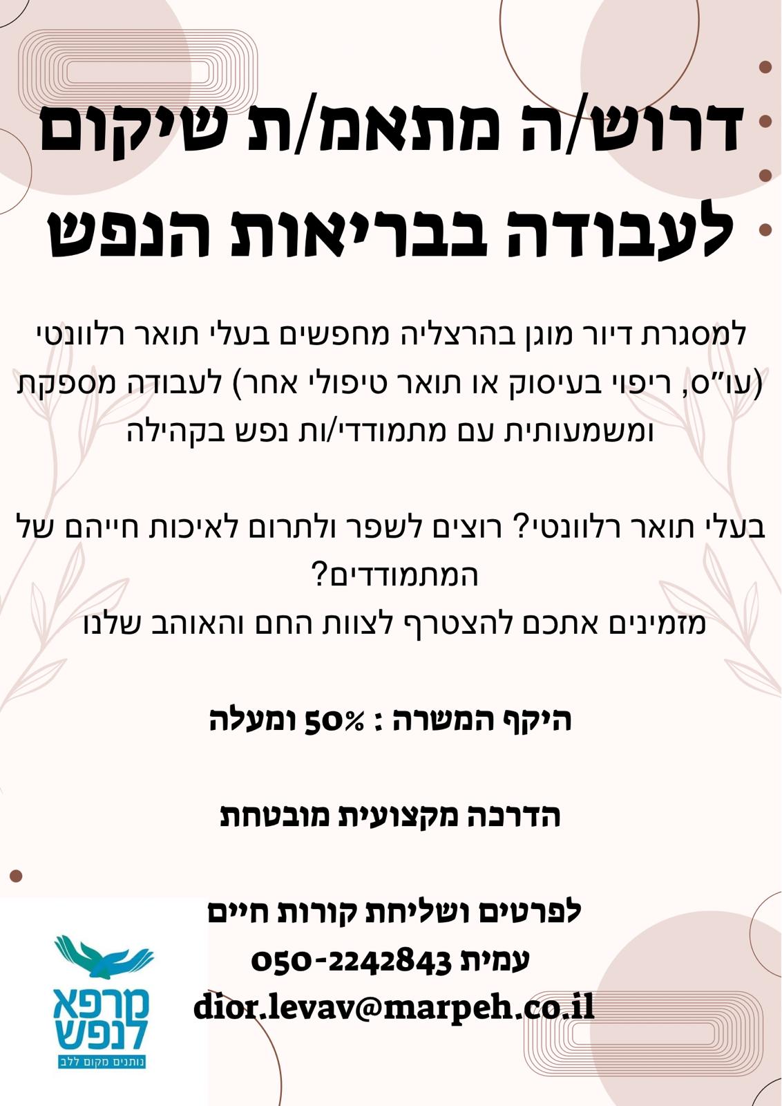 תחום עיסוק: אוטיזם, אלימות, בריאות הנפש, דיור, הנמכה קוגניטיבית, התמכרויות, טראומה, מיניות, מש״ה, סיכון, תעסוקה נתמכת