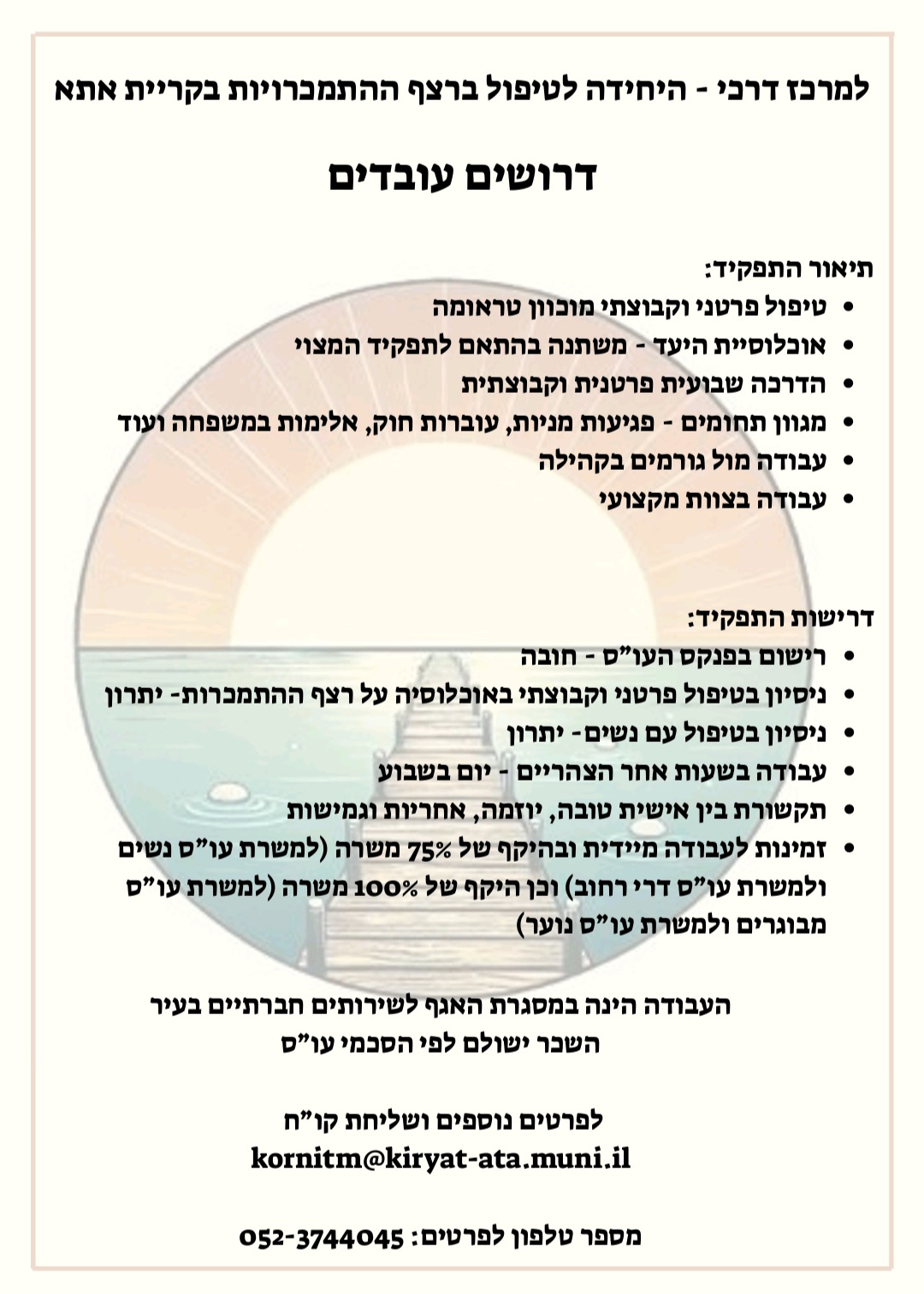 תחום עיסוק: אוטיזם, אלימות, בריאות הנפש, דיור, הנמכה קוגניטיבית, התמכרויות, טראומה, מיניות, מש״ה, סיכון, תעסוקה נתמכת